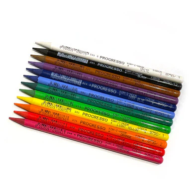 Koh-i-Noor’s Progresso Woodless pencils are unique solid color lead sticks with a lacquer coating. They have a pleasantly weighty feel and contain a wide range of dense, evenly dispersed pigments that lay down easily. They work beautifully in delicate layers or in heavy strokes, and because of the softness of the lead they blend extraordinarily well. Since there is no wood casing, woodless colored pencils are excellent for precise artwork as well as broad, loose strokes, and shading work. They can be sharpened with a traditional pencil sharpener, and the shavings can be used for smudging in color.